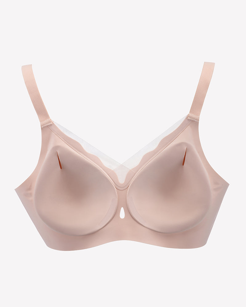 Beige seamless wireless push-up bra, breathable mesh, perfect for everyday wear