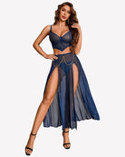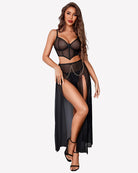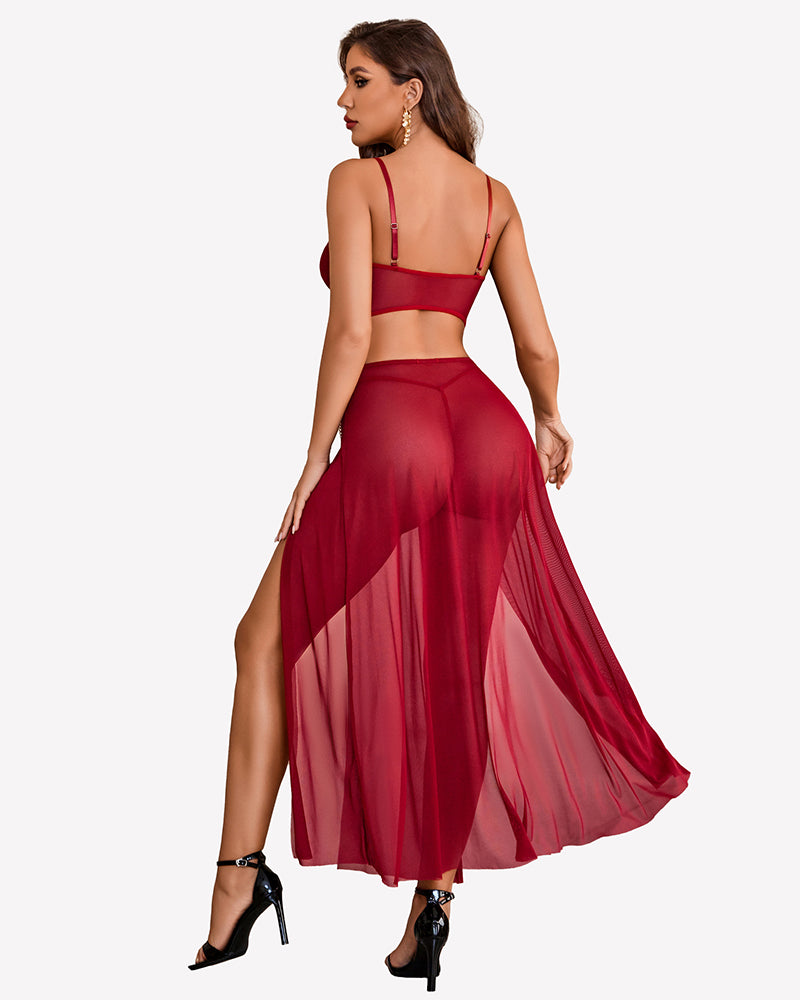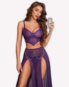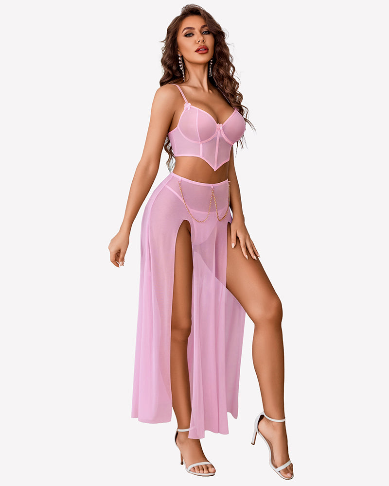 • Design: Sheer; Crop Top Type: Wireless, Adjustable shoulder strap, Bow decoration, No Padding; Skirt Type: Two side split, Waist chain decoration, Elastic waistband, Removable chain, Long skirt; Panty Type: Thongs