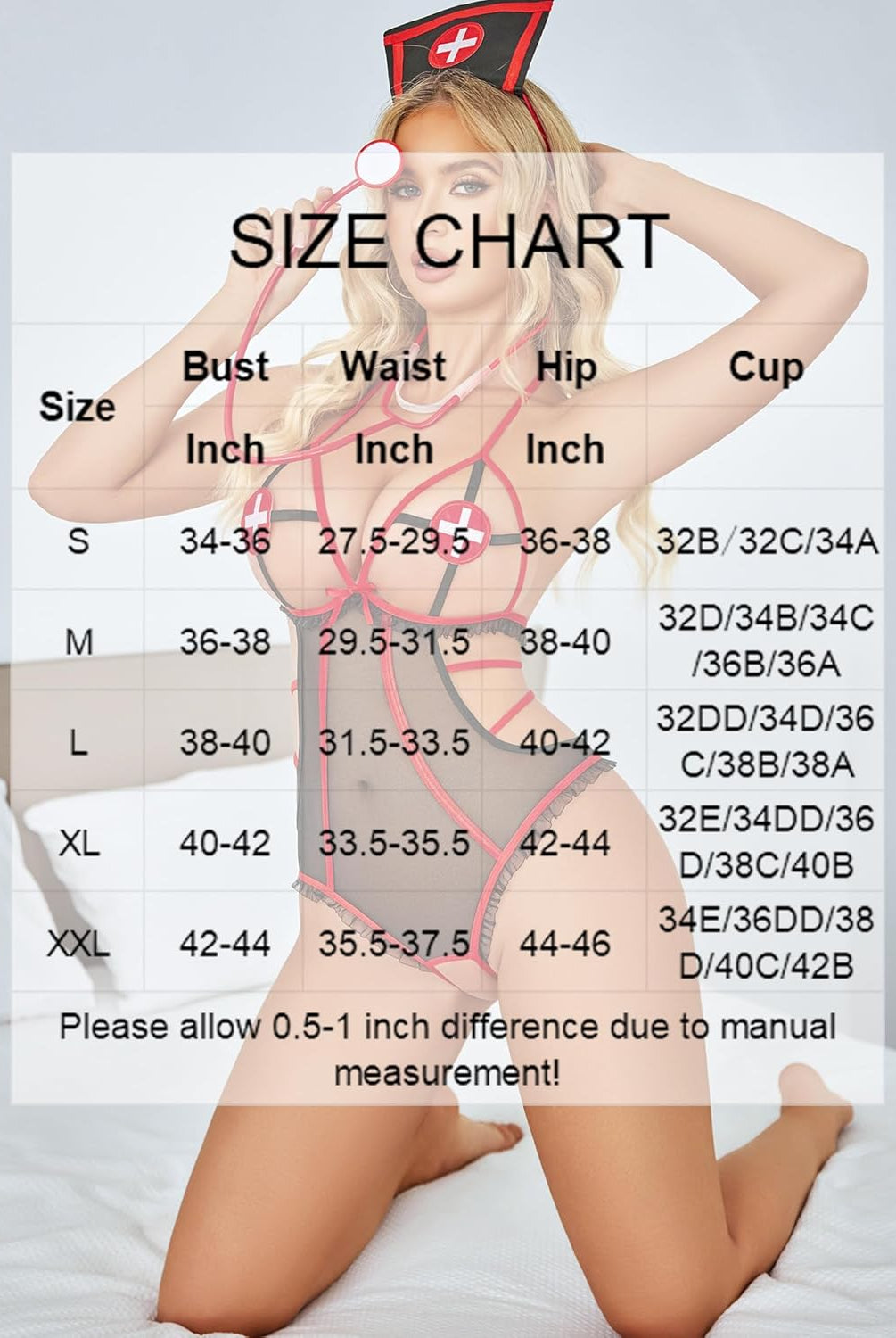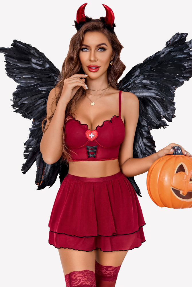 Red mesh lace roleplay nightwear with white lace trim, bow, and adjustable straps.