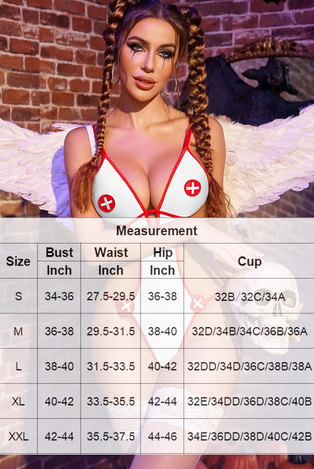 Christmas Maid Lingerie Roleplay Cosplay Set, red and white, with lace trim and garter