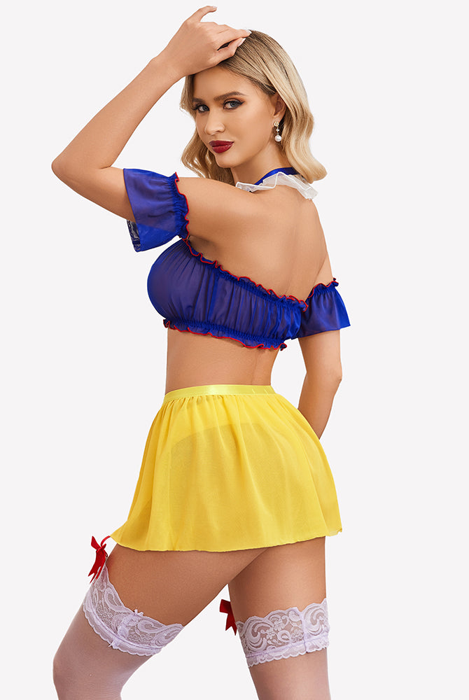 Blue and white French maid costume with apron. Sexy lingerie outfit with lace details.