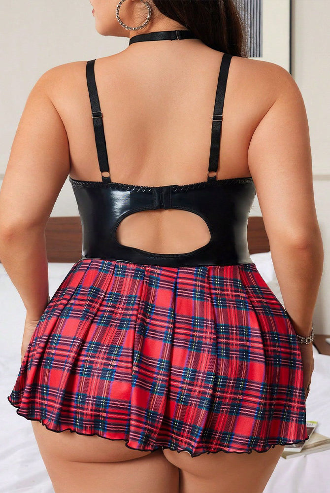 Red plaid print maid roleplay lingerie set with lace trim, apron, skirt, and choker.