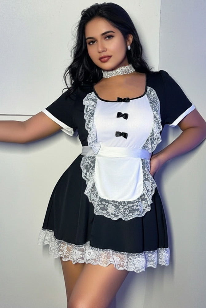 Black maid roleplay lingerie with white lace trim, ideal for cosplay costumes and roleplay.