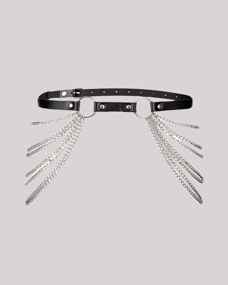 - A bold fusion of sleek PU leather and cascading silver chains that accentuates your curves with effortless drama and irresistible allure.