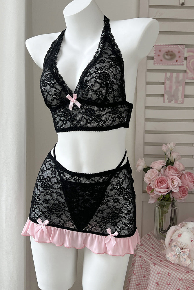 Ruffled Lace Trim Lingerie Set with Heart Stickers