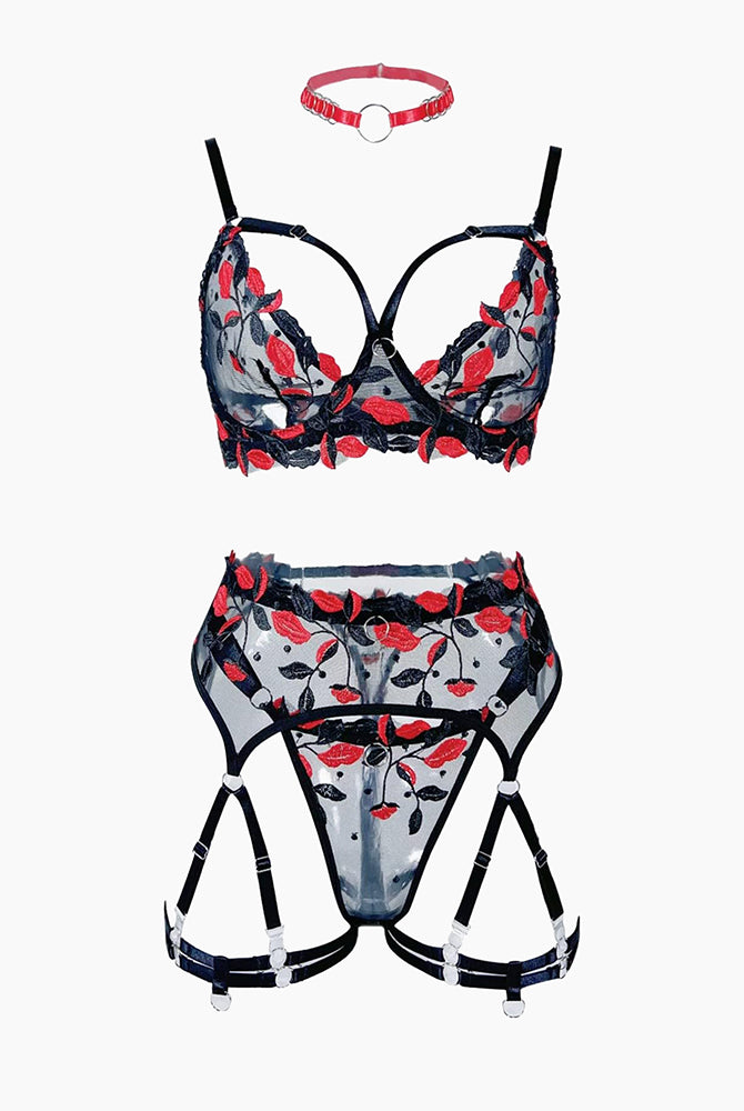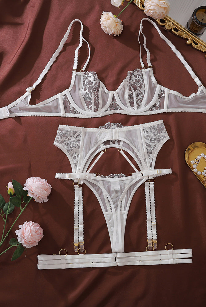 Sheer Embroidered Floral Lingerie Set with Garter Belt