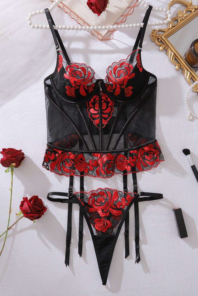 Embroidered Red Rose Lace Corset Lingerie Set