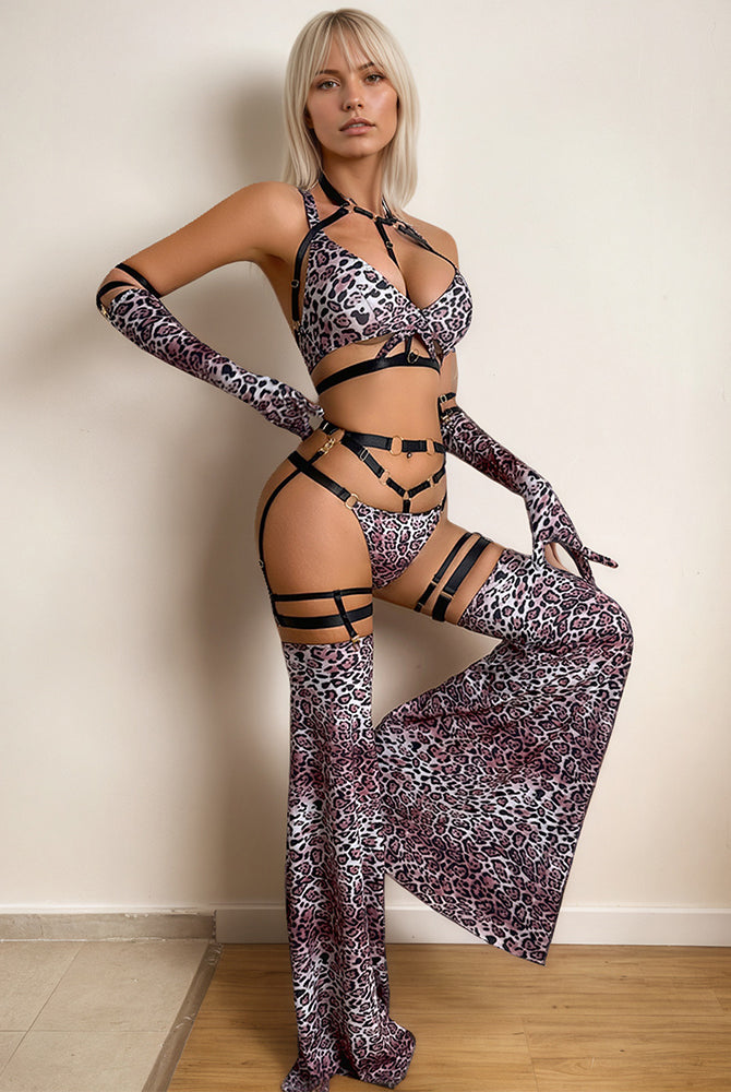 Leopard Harness & Flare Lingerie Set with Gloves