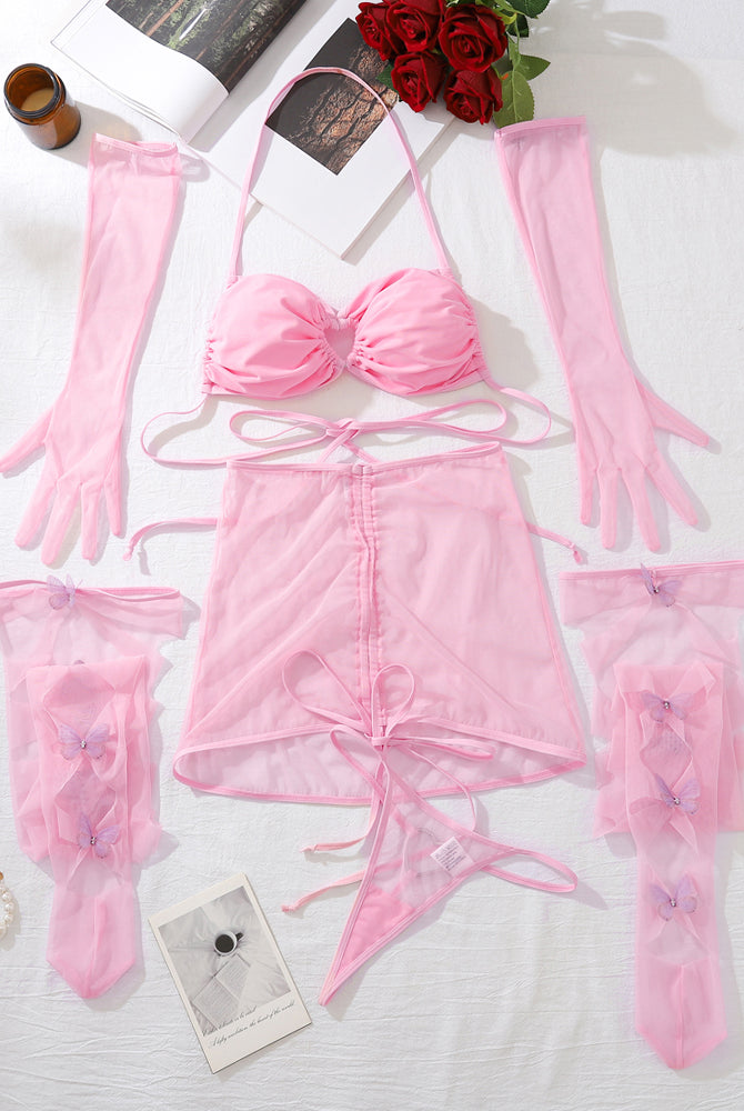 Pink Sheer Mesh Butterfly Socks Lingerie Set