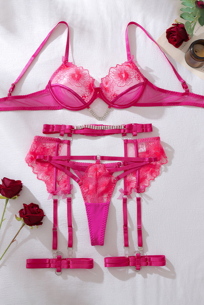 Pink Floral Lace Harness Lingerie Set