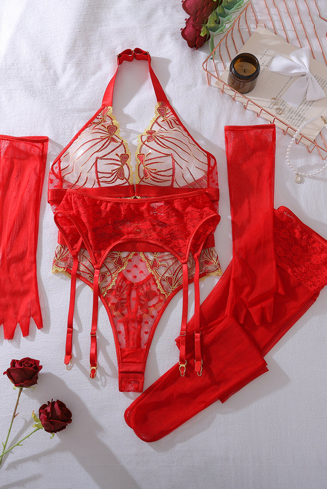 Red Heart Embroidered Lace Lingerie Set