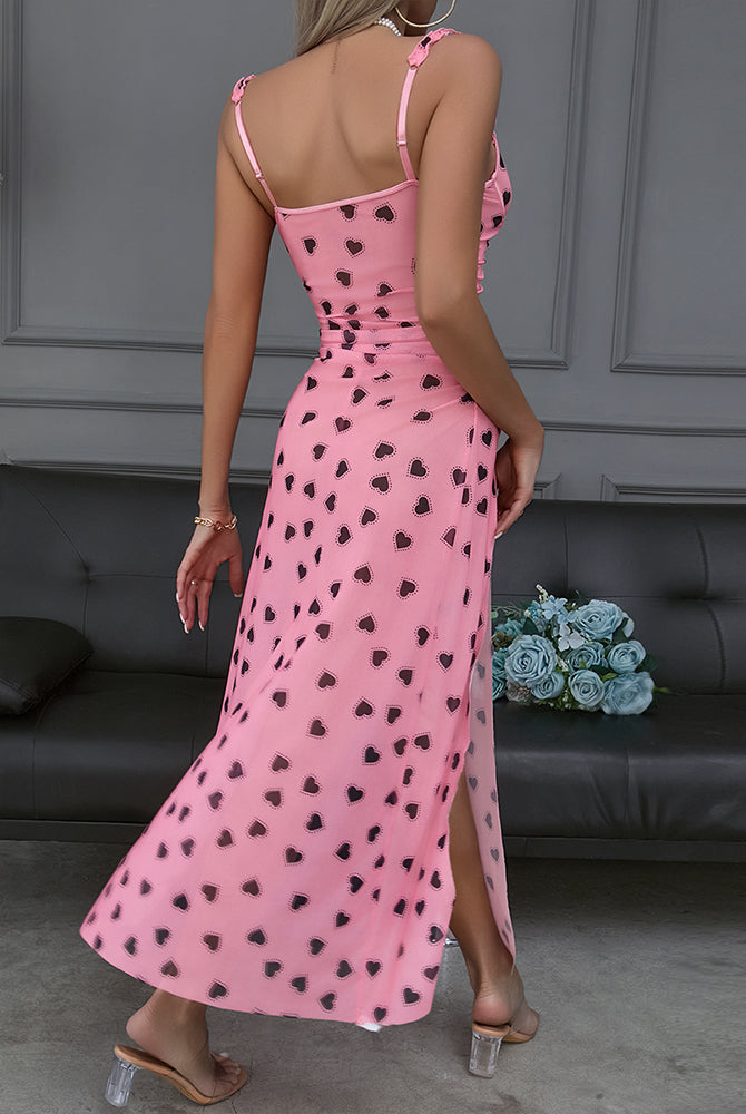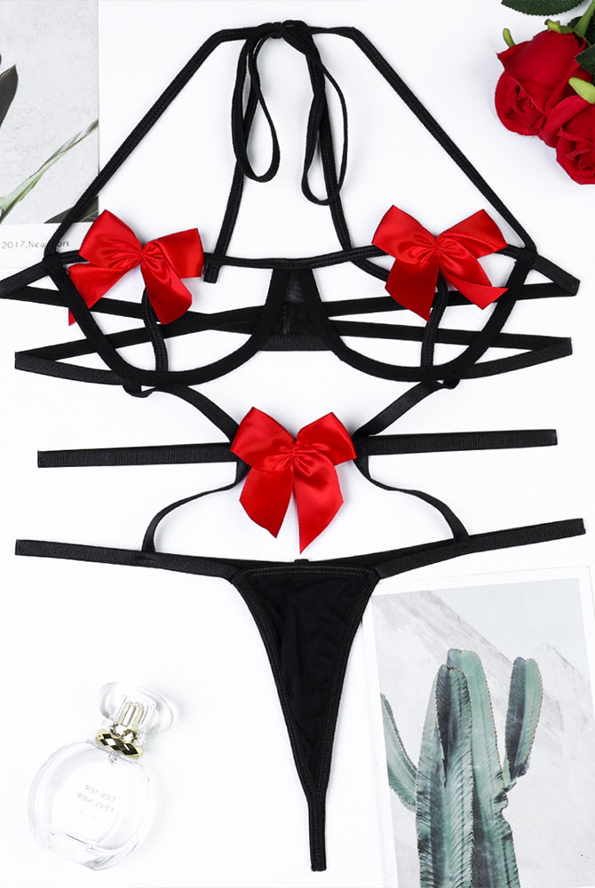 Black Bra with Red Bows & Kiss-Print Skirt Set