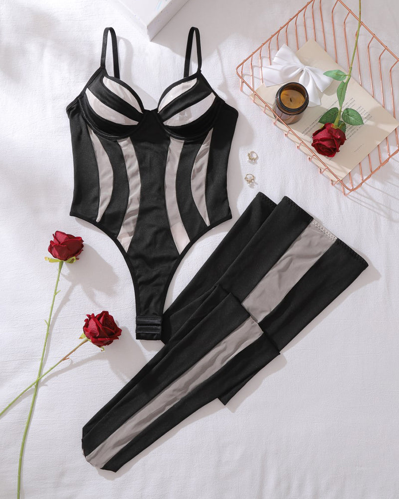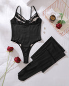 - A sophisticated lingerie set consisting of a black strappy bodysuit and stockings.