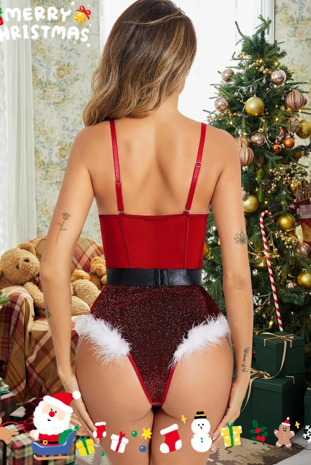 Red Christmas lace babydoll lingerie with lace cups and holiday print on a model.