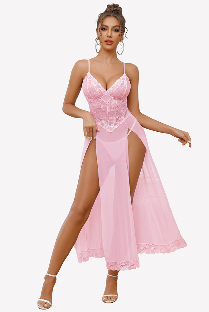 Pink Avidlove babydoll nightgown with lace cups, floral mesh and halter neck. Romantic lingerie.