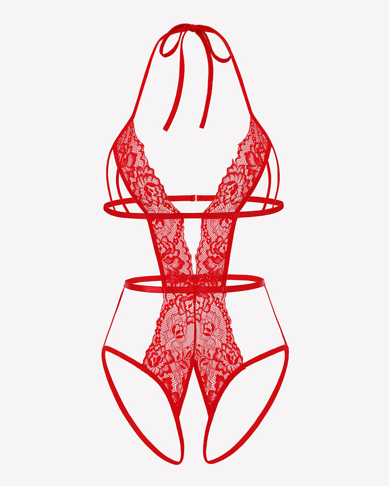 Deep V Halter Lingerie Crotchless Lace Bodysuit