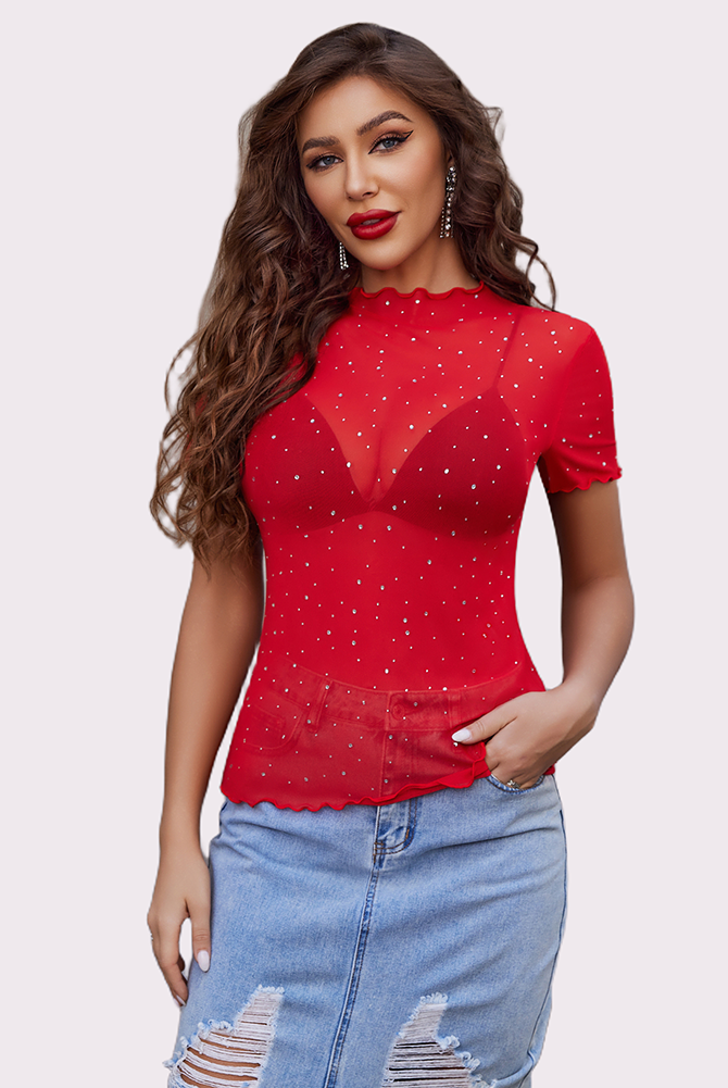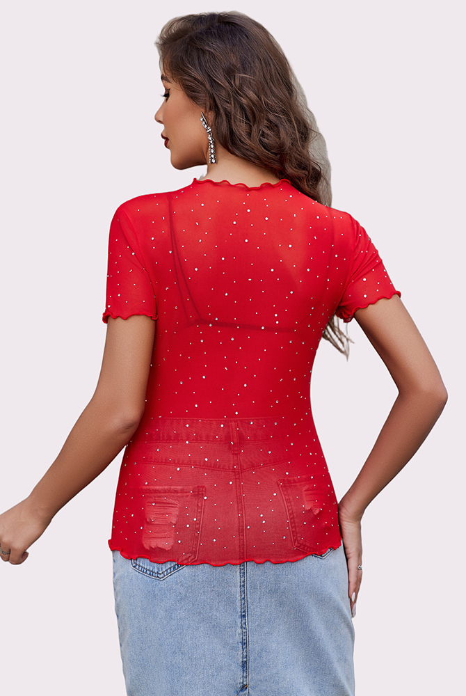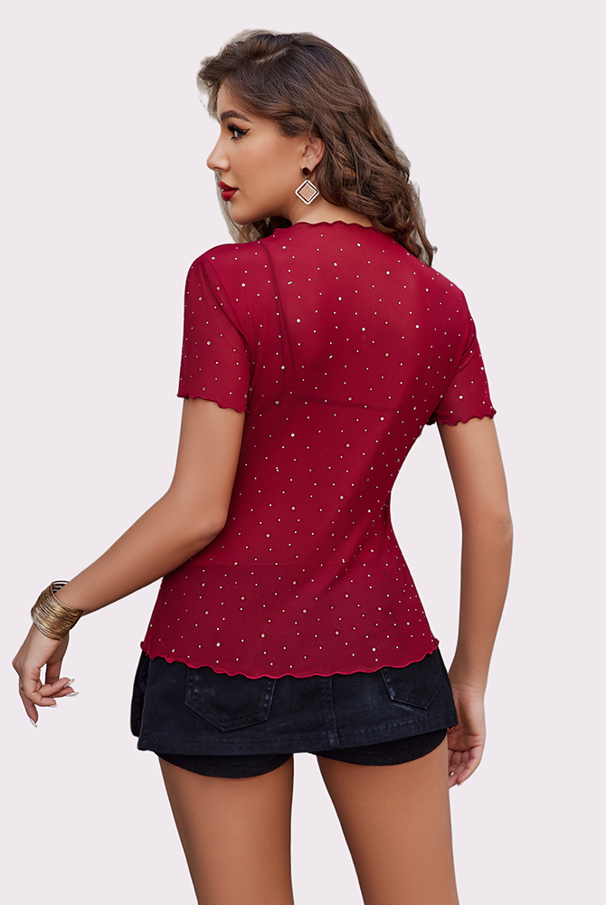 Mesh Tops Short Sleeve Rhinestone Shirts