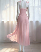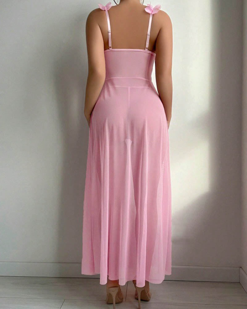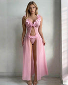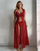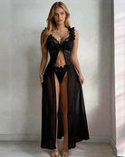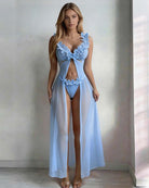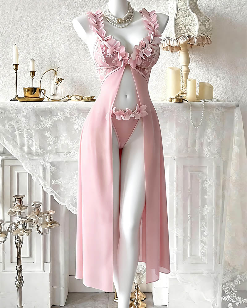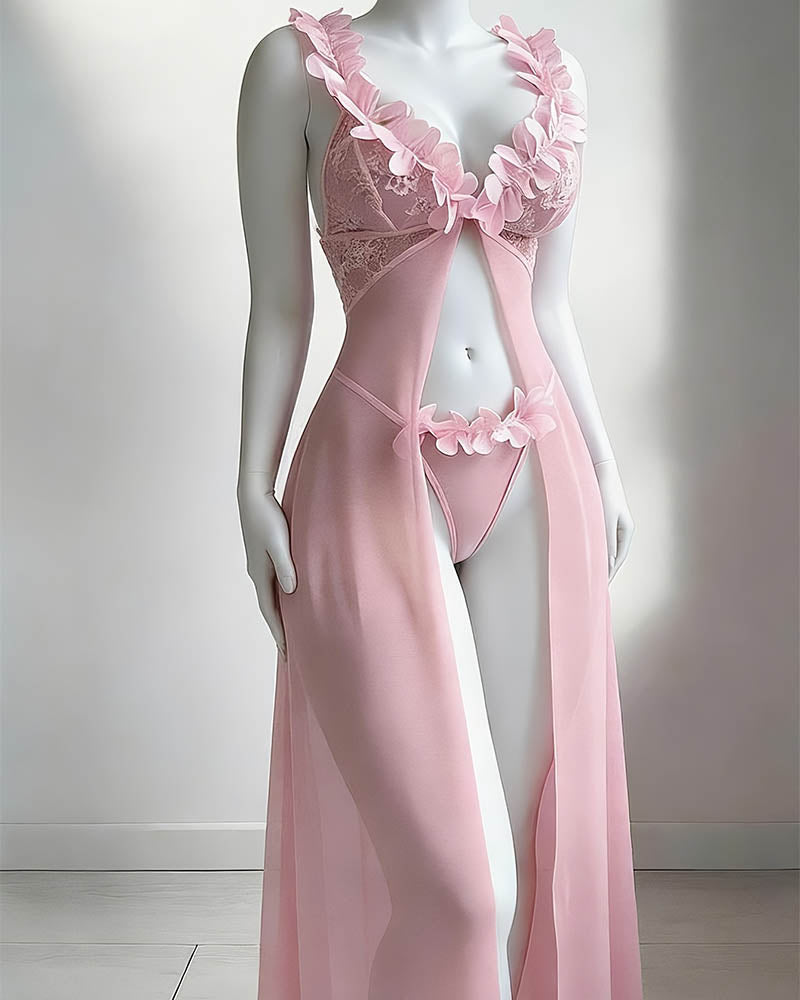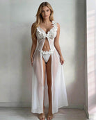 The Floral Lace Lingerie Set pairs a deep-V lace bralette with a floor-length sheer mesh skirt and matching thong — a three-piece set designed to make you feel breathtaking.