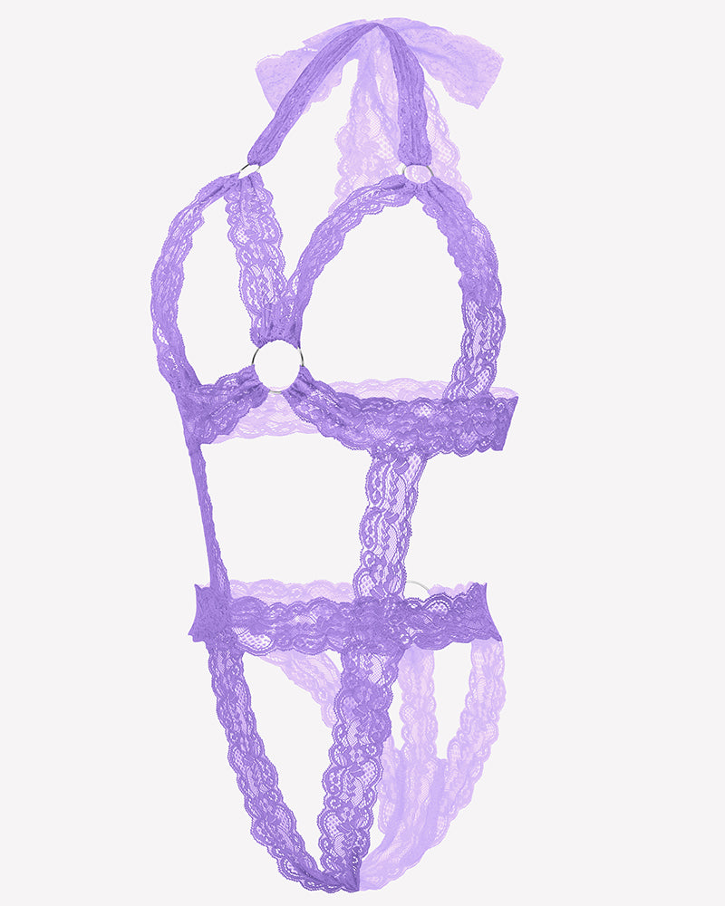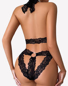 - Women's floral lace teddies mini bodysuit features halter neck and backless design.This sexy plunging one piece lingerie has sleek and sexy silhouette. It accentuates your natural shape beautifully.