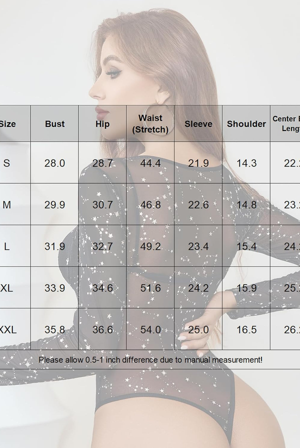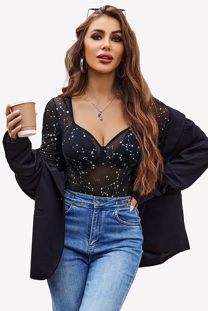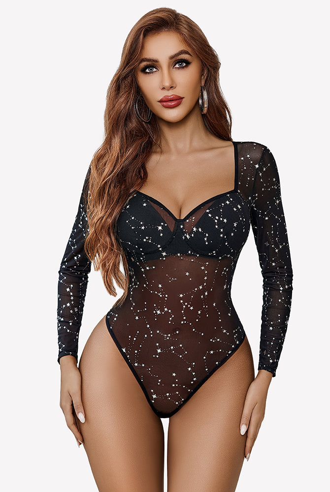 Long Sleeve Bodysuit Sparkle Mesh Top