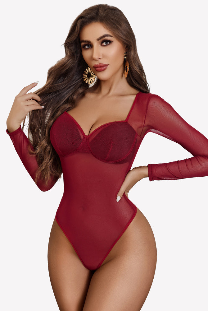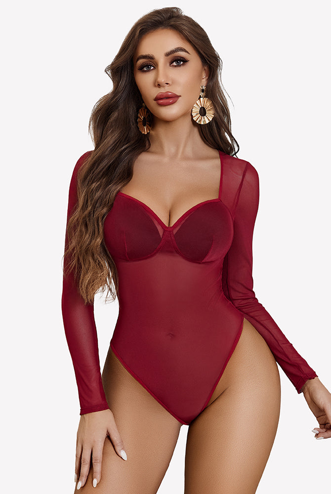 Burgundy V-neck lace teddy push-up bodysuit with adjustable straps, perfect for bridal or sleepwear