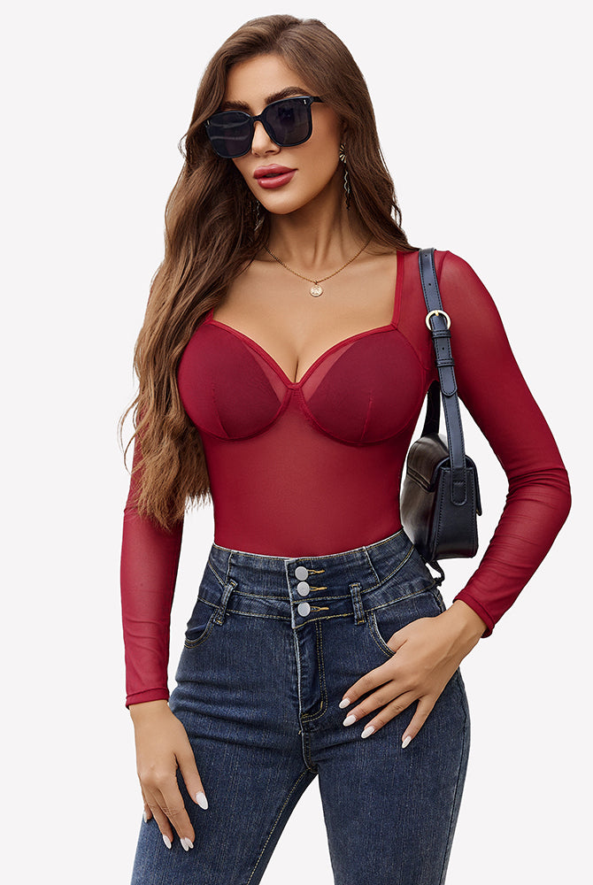 Bell Long Sleeve Bodysuits Mesh Leotard Tops