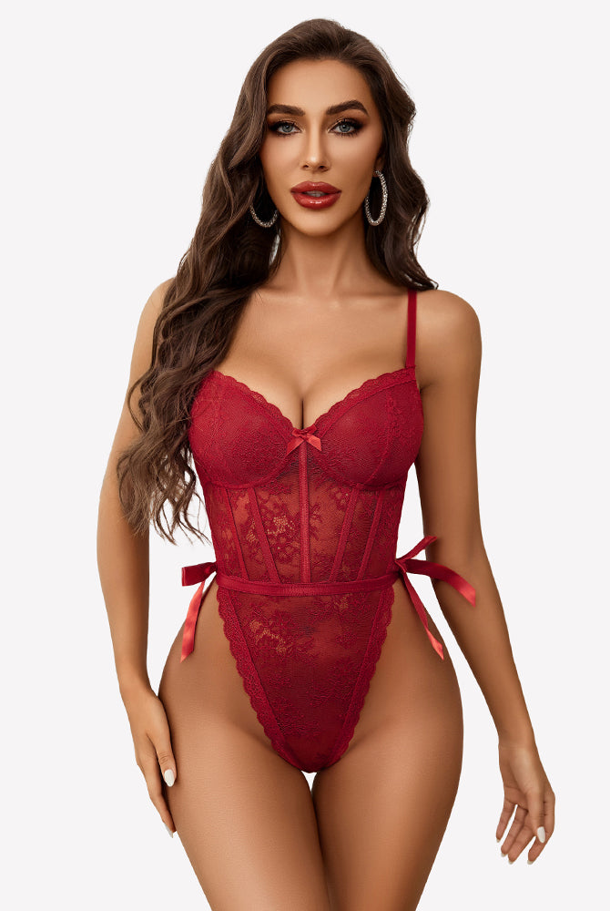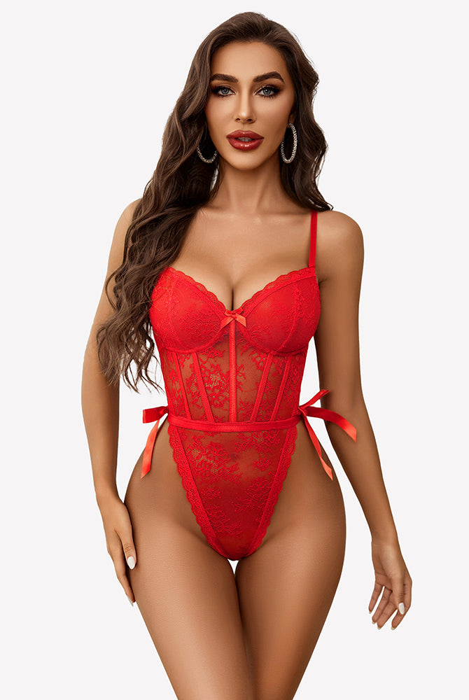 Red lace teddy bodysuit with push-up design and adjustable straps, V-neck lingerie for women.