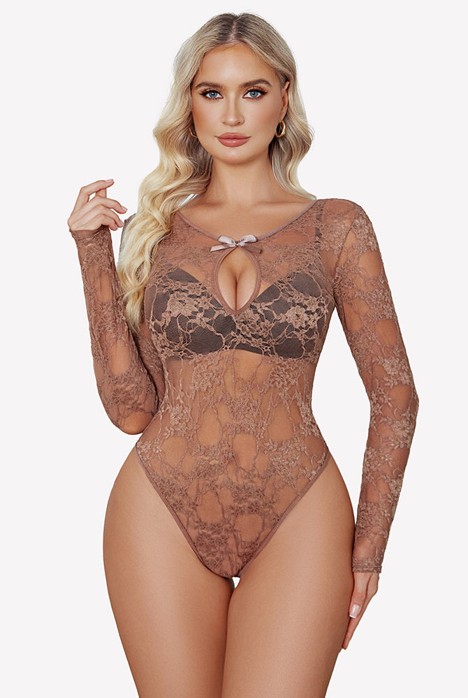 Brown square neck lace bodysuit with lace trim, Avidlove lingerie, highlighting the collarbone.