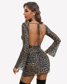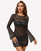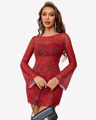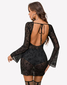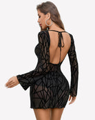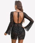 - Design: Material--Sheer single layer mesh fabric; Neck--Boat Neck; Sleeve Type--Bell Long SLeeve; Dress Length--Above Knee Length; Back Type--Backless, Tie Back; Hem Shaped--Flared
