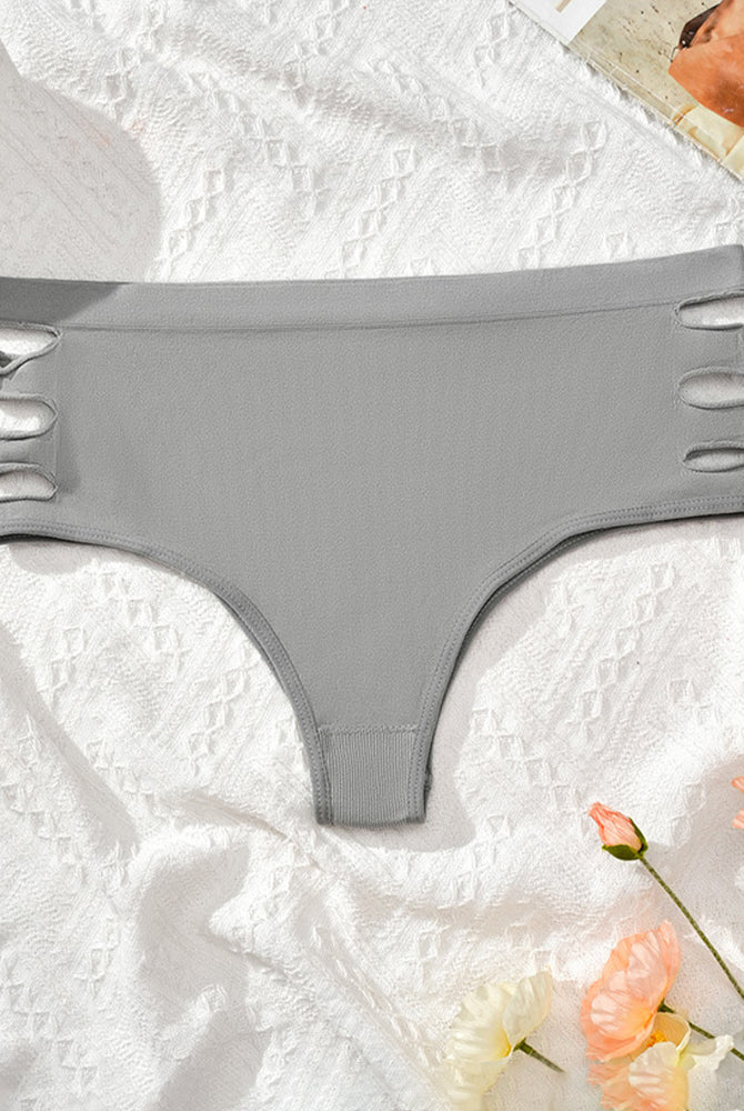 Grey lace hipster briefs with floral lace detail. Sexy, comfortable, mid-rise panty.