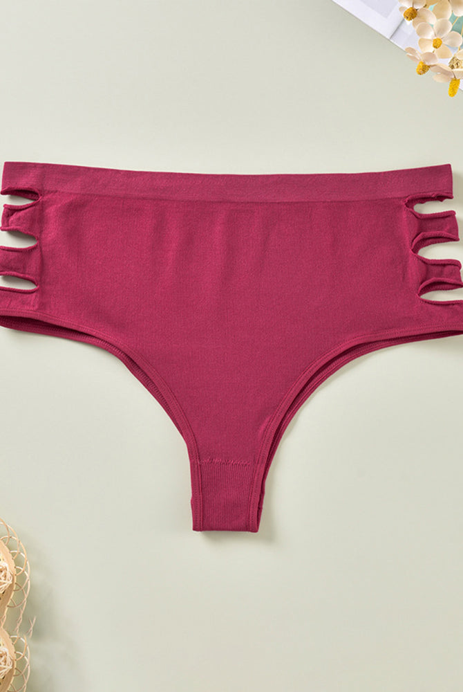 Burgundy plus size lace triangle panties with cut-out design and criss-cross back detail