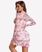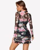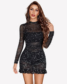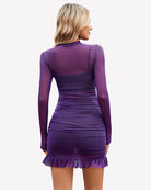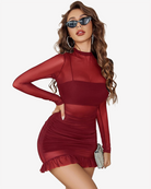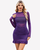 • Mini bodycon dress with ruffle hemline and mock neck makes a fun and flirty statement in this curve-skimming mesh dress complete with side ruching.