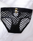 Unleash quiet temptation in these fishnet panties, where golden heart-shaped rings frame daring cutouts and sheer mesh weaves a spell of effortless allure.