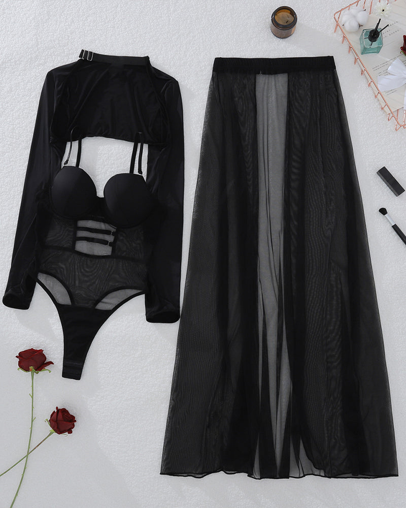 Mesh Underwire Bodysuit Skirt 3 Pieces Sets