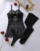 Draped in intricate floral lace and sheer mesh, this sultry two-piece set combines a spaghetti-strap mini slip dress with matching thigh-high stockings for an effortlessly alluring look. The scalloped eyelash lace hem, open back with adjustable straps, and delicate layered panels create a silhouette that is both daring and refined.