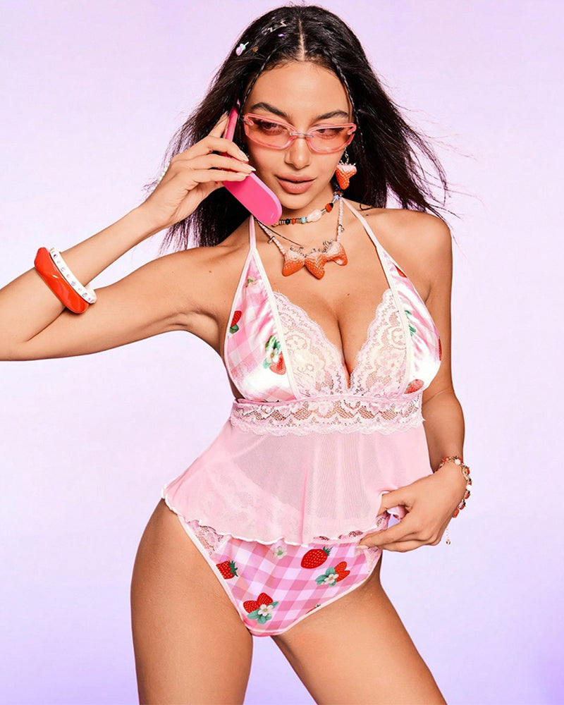 Sheer Lace Sleepwear with Red Lips & Hearts
