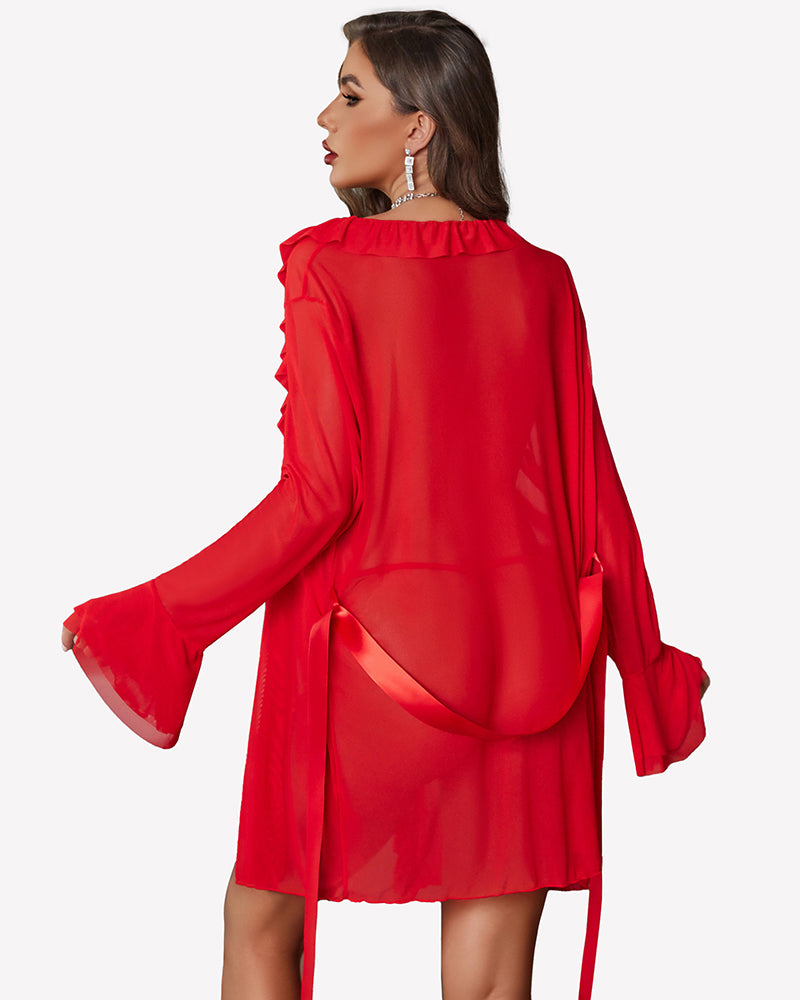Mesh Robe Sets Kimono Ruffle Nighty With Thong