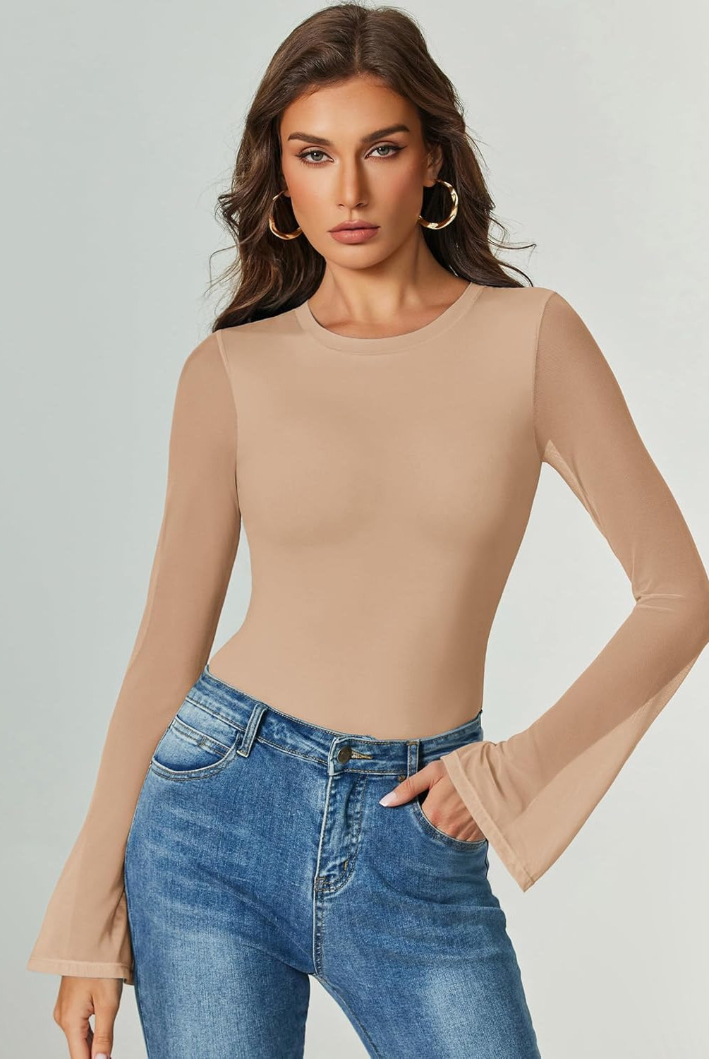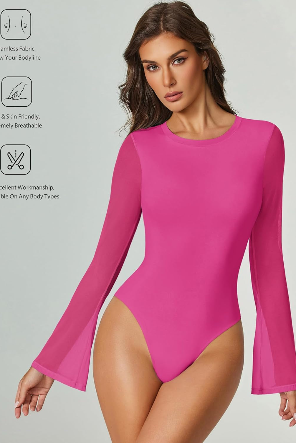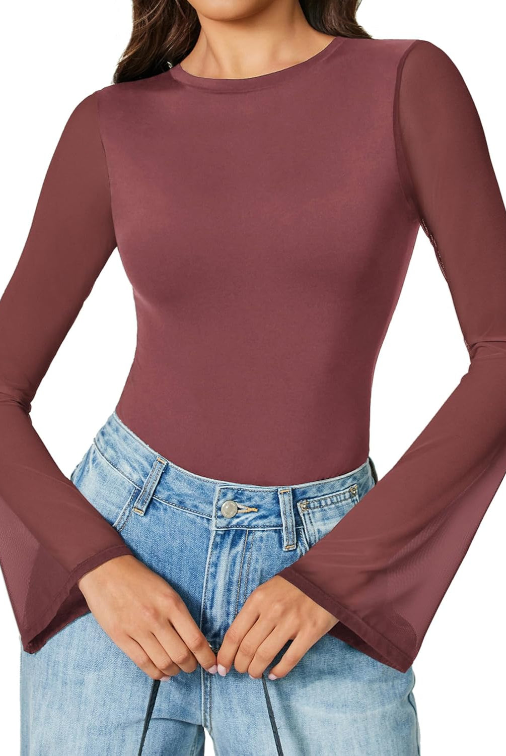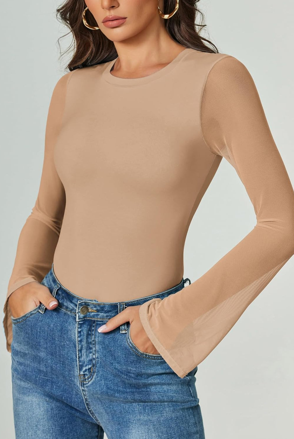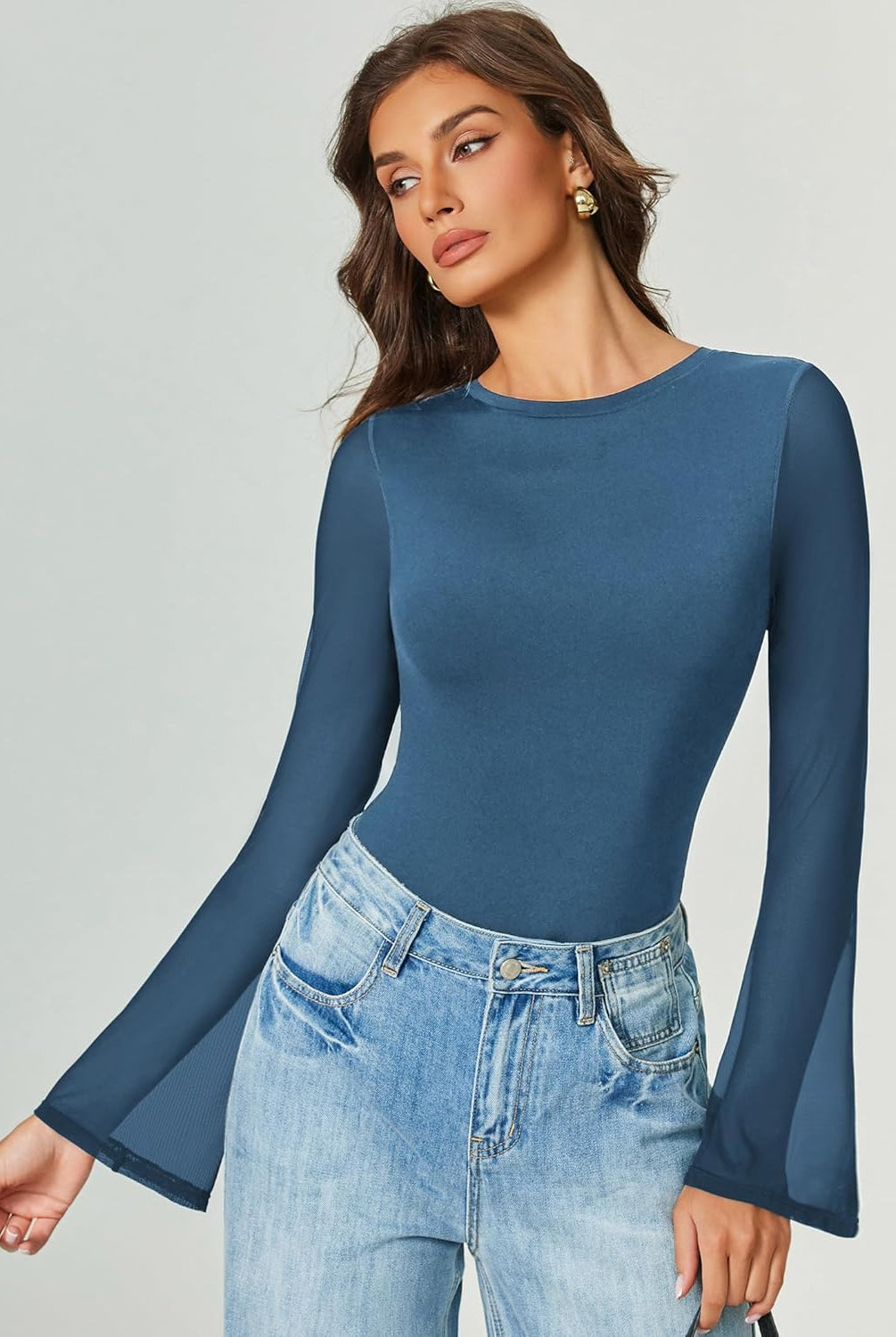 Bell Long Sleeve Bodysuits Mesh Leotard Tops