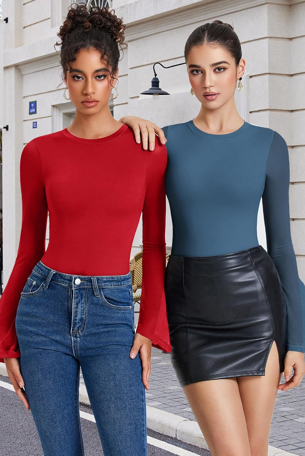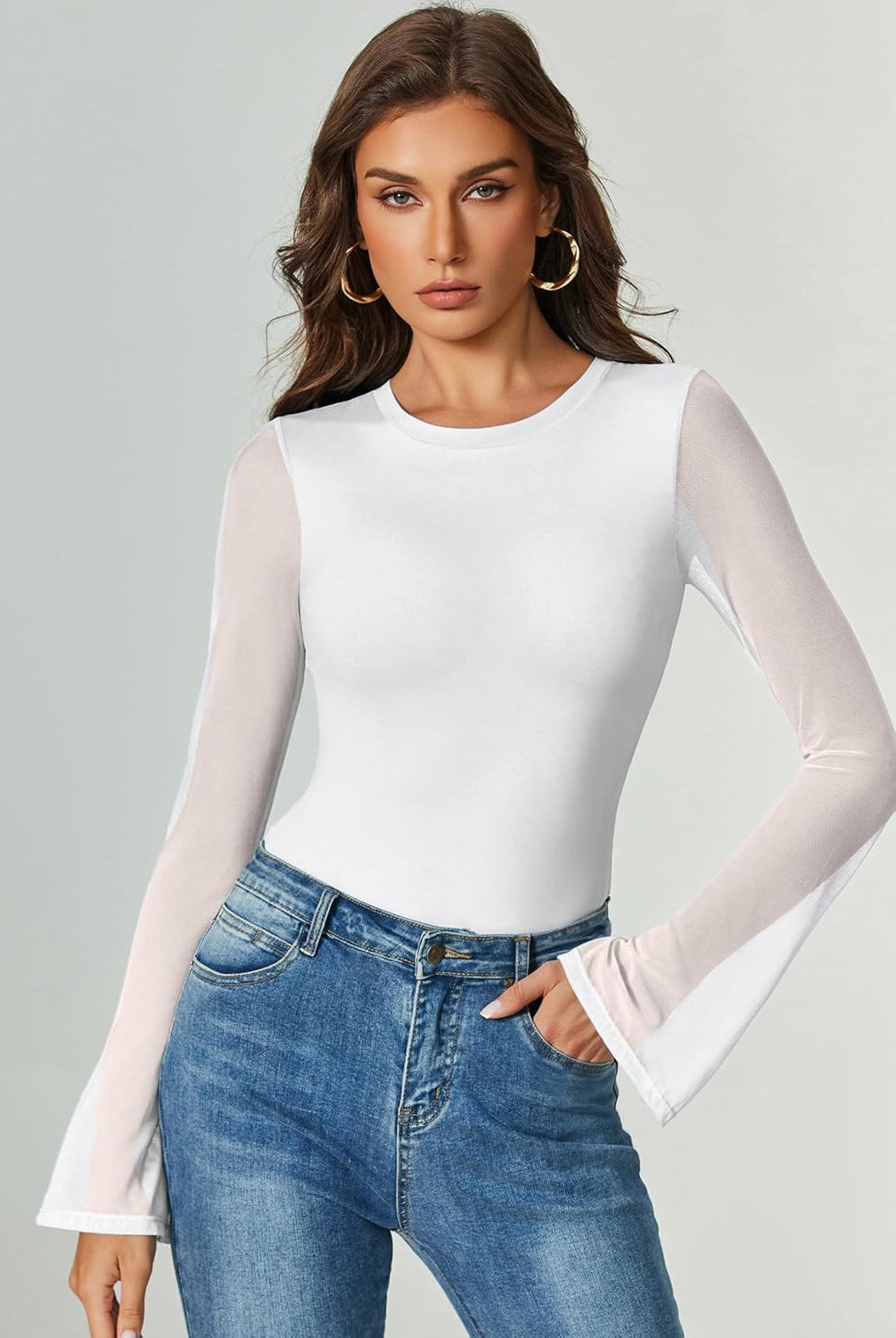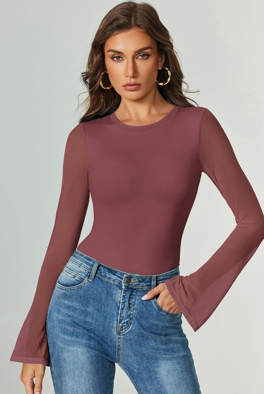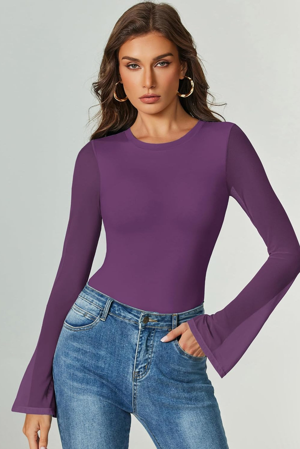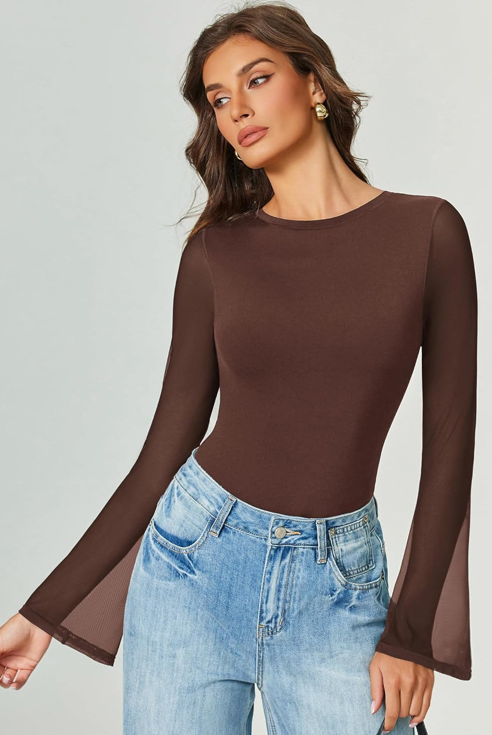 Bell Long Sleeve Bodysuits Mesh Leotard Tops