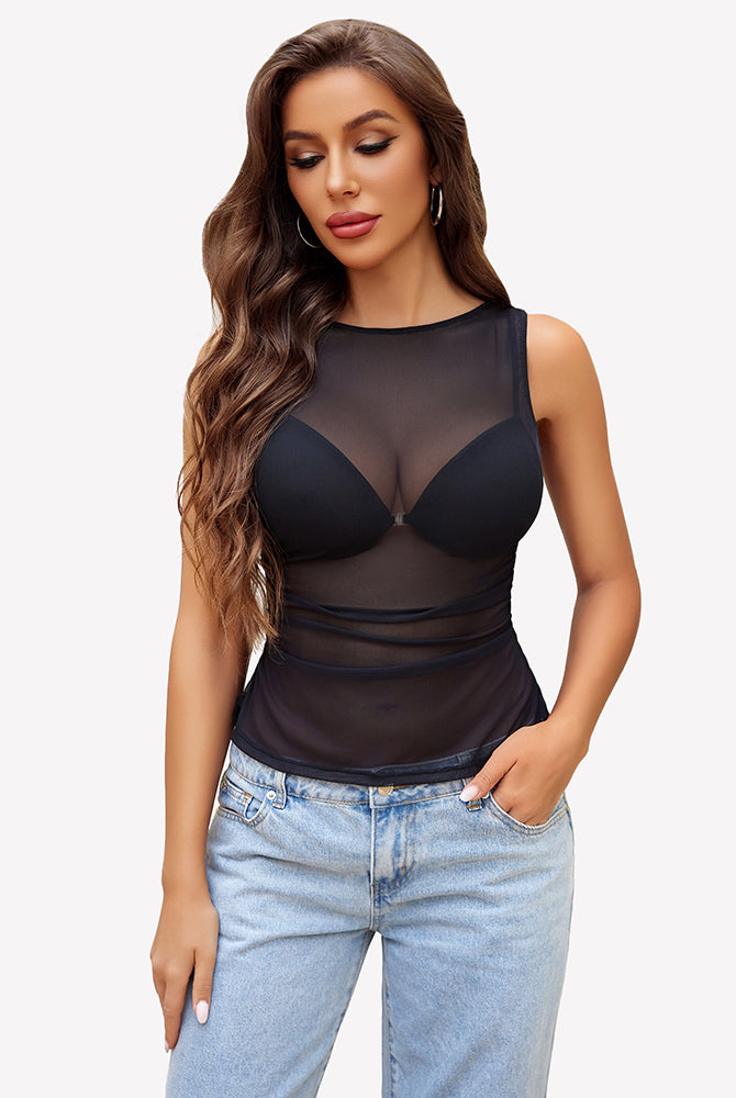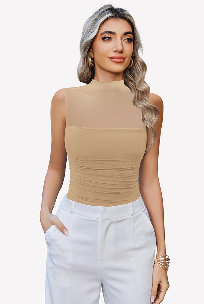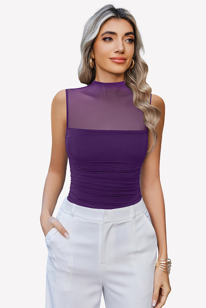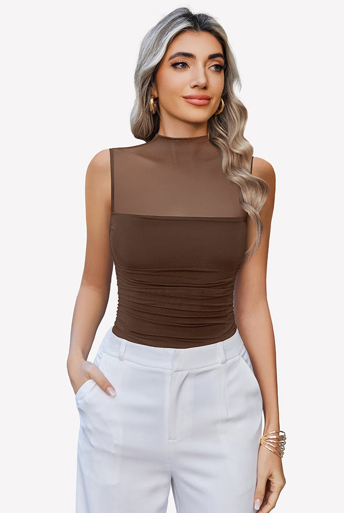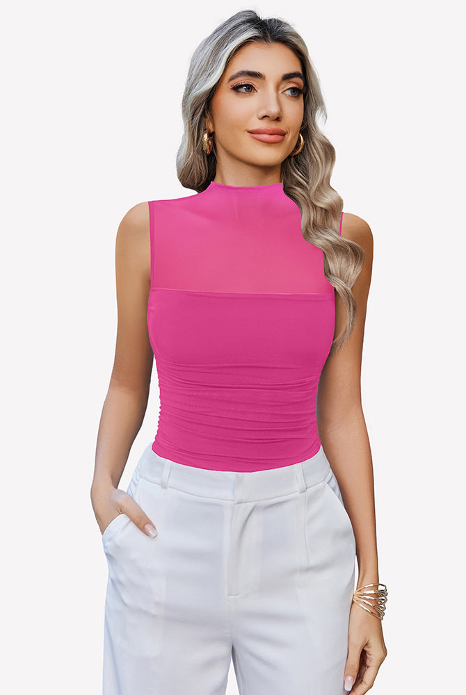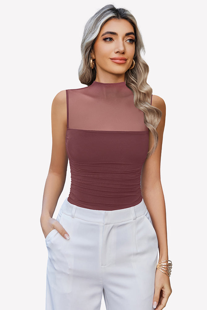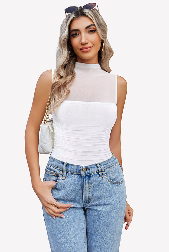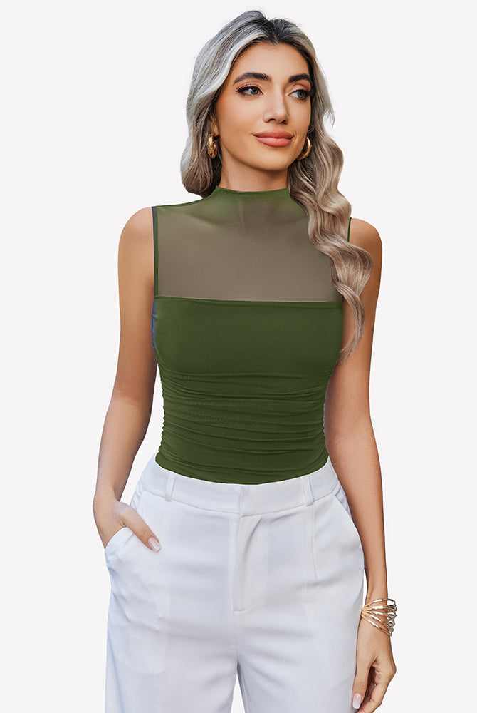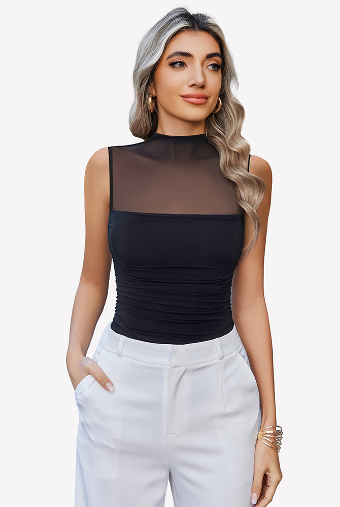Mock Neck Mesh Bodysuit Ruched Tank Top