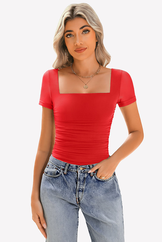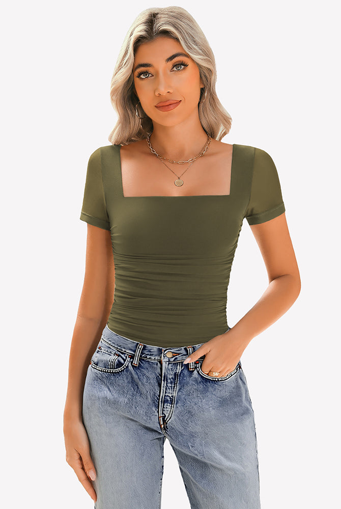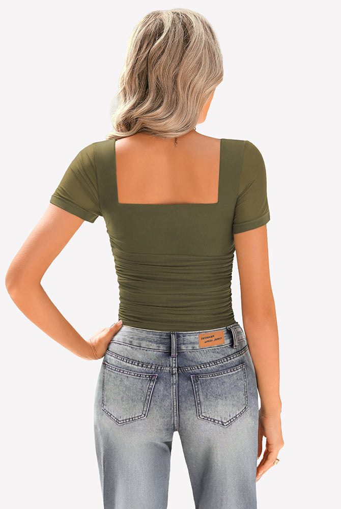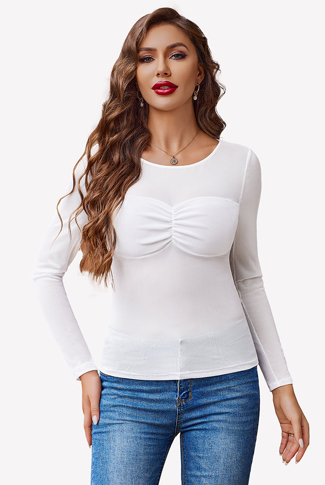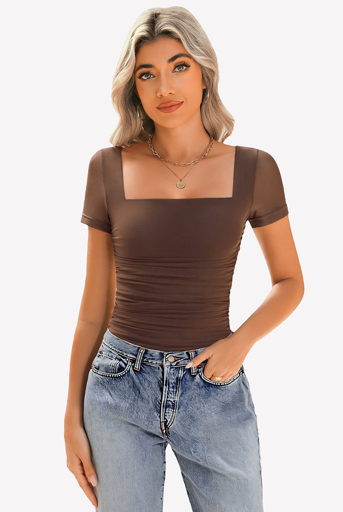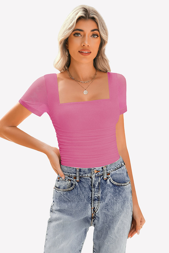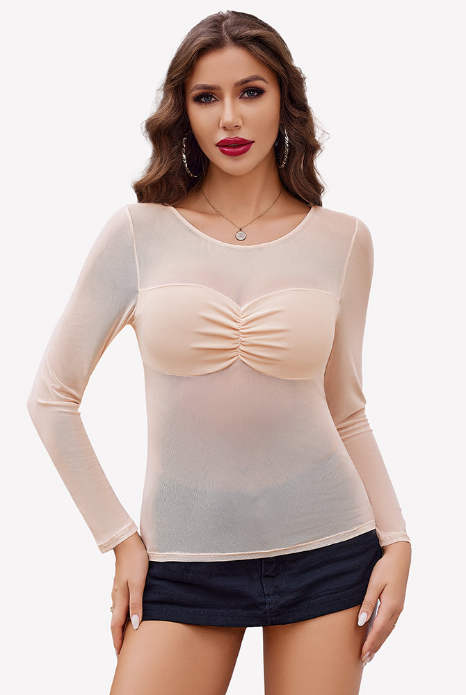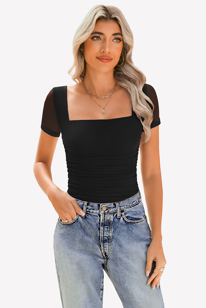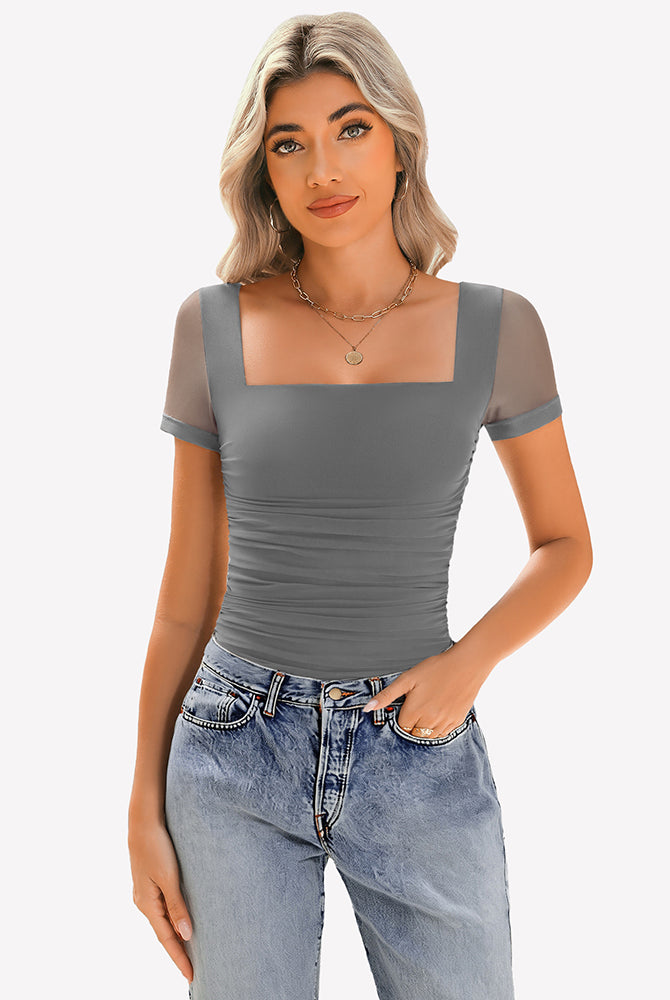 Sheer Mesh Short Sleeve Ruched Tops