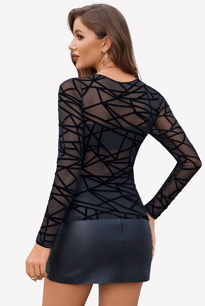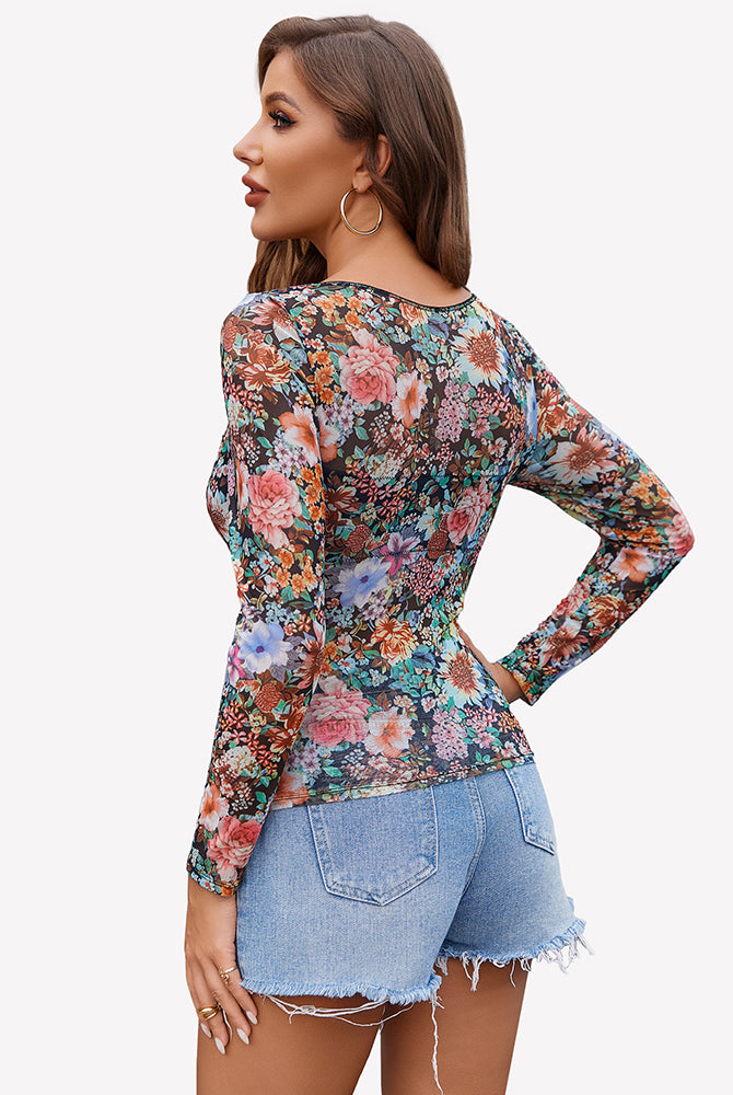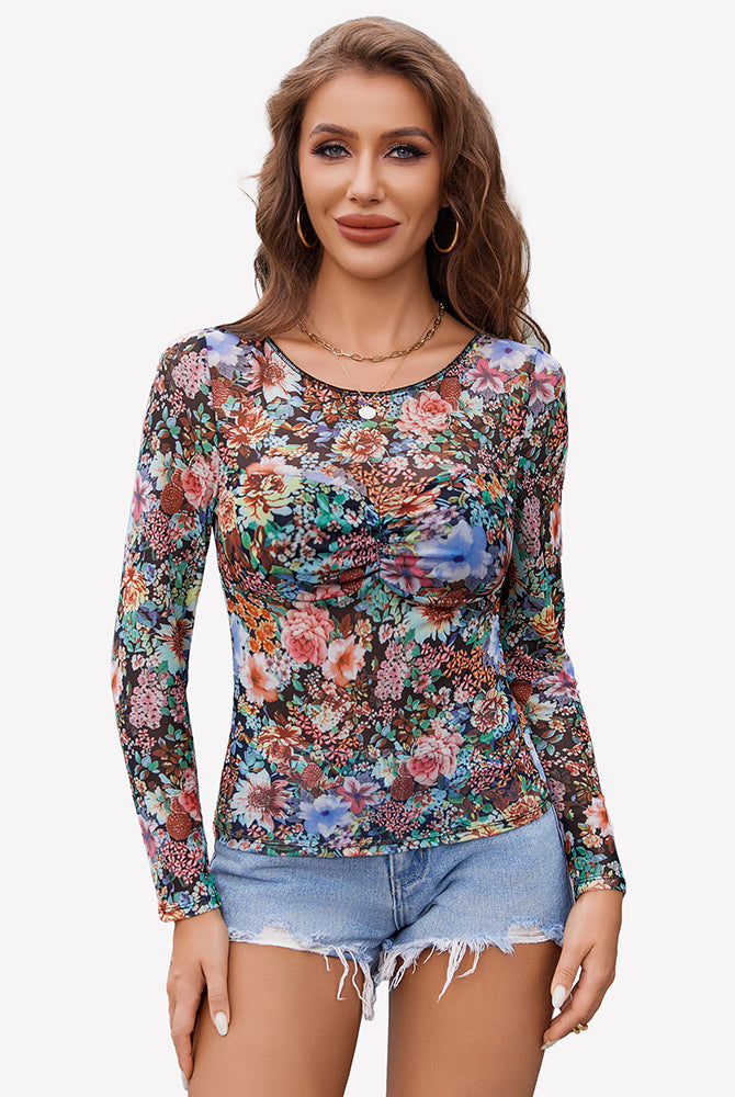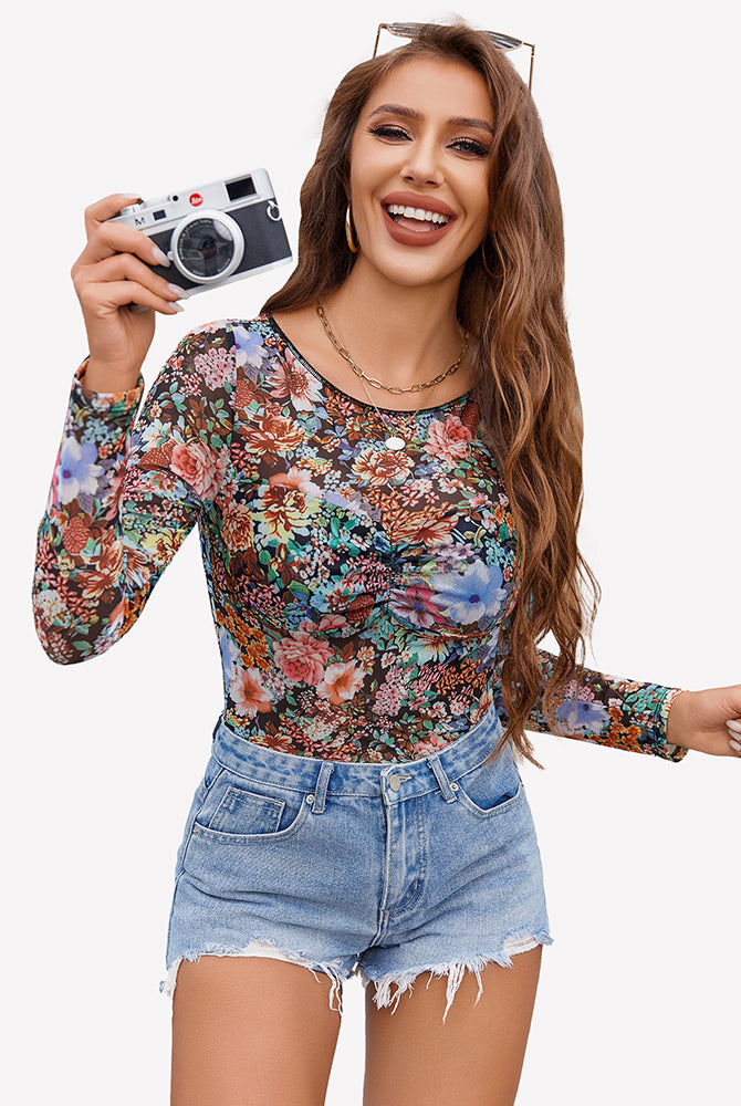 Mesh Floral Long Sleeve Tops