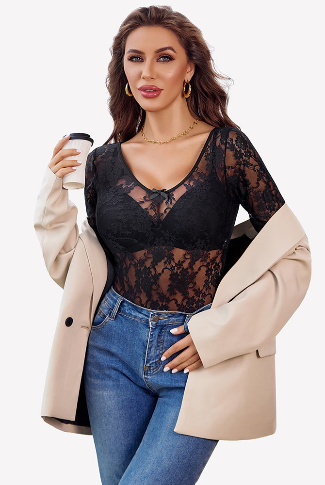 Long Sleeve Lace V Neck Leotard Shirt