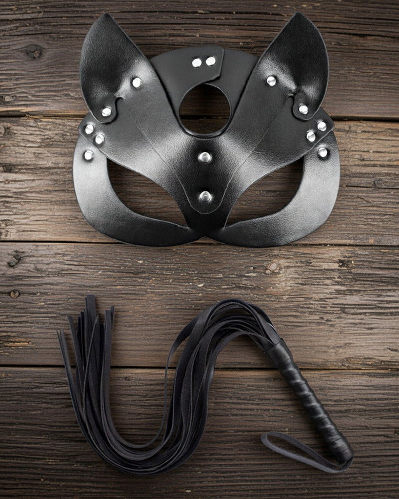 Feline mystique meets commanding elegance. This handcrafted black leather cat mask features sharp pointed ears, strategically cut eye openings, and gleaming silver studs that frame the face with quiet authority. A built-in collar with O-ring connects seamlessly to the included detachable leash and chain — ready to awaken your inner kitten or lead the scene with poised seduction.
