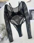 A seamless veil of midnight mesh. This long-sleeve fishnet bodysuit wraps the body in intricate open-weave netting, featuring a plunging scoop neckline and a striking open back framed by adjustable straps with gleaming metal rings.