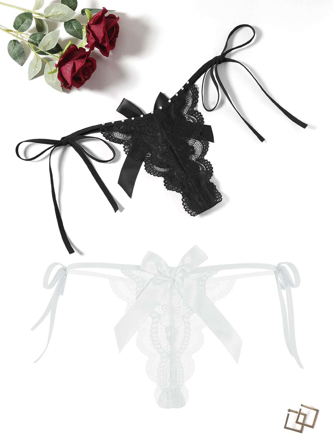 - lace underwear with bows and pearl for meeting fashion need. The low rise lace thongs panties is designed special floral lace trim, which is full of beauty and mystery. Sexy G string thong make you beautiful and charming all day
