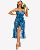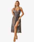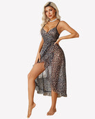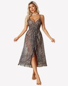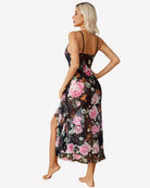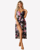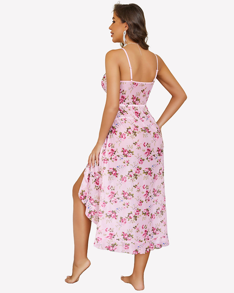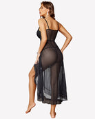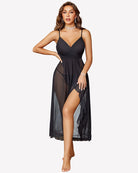 - Mesh nightgown with faux wrap design, layered cup, deep V neck, sleeveless, adjustable strap, asymmetric ruffle hem, midi length, high waist A-Line silhouette cut classic and never out of fashion