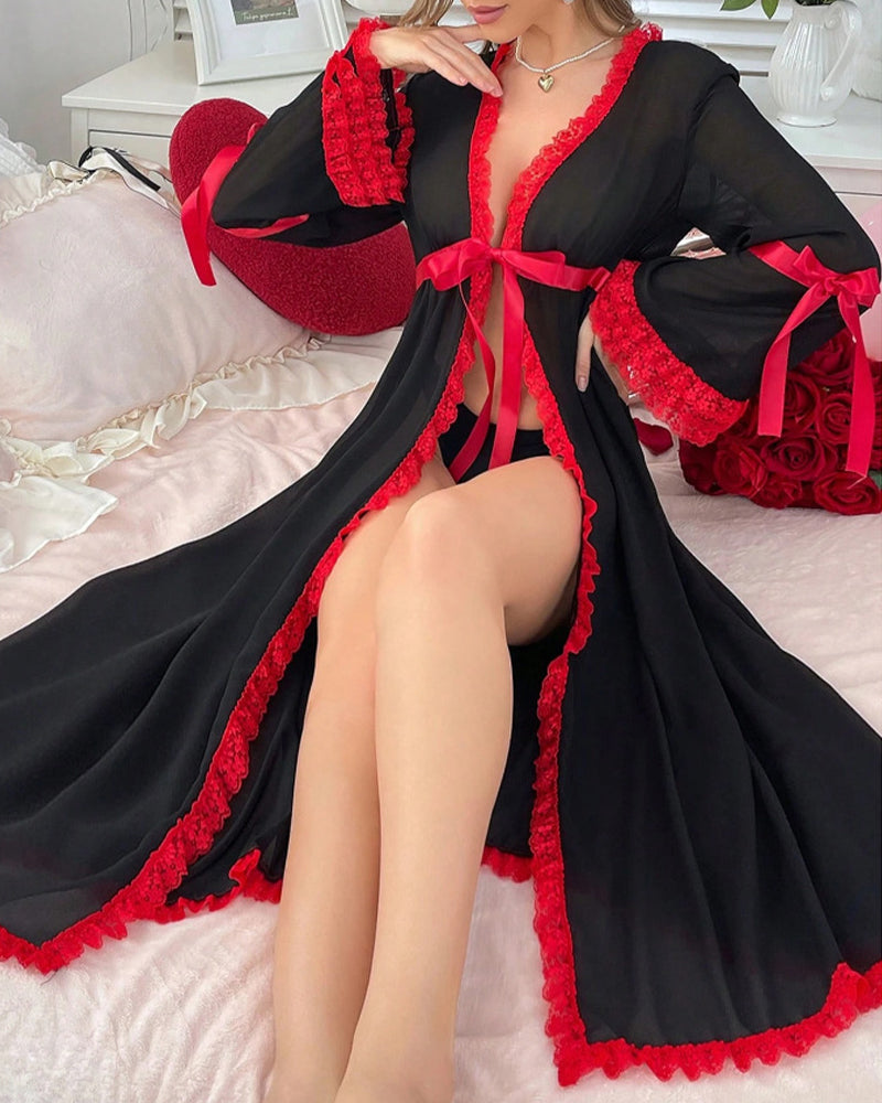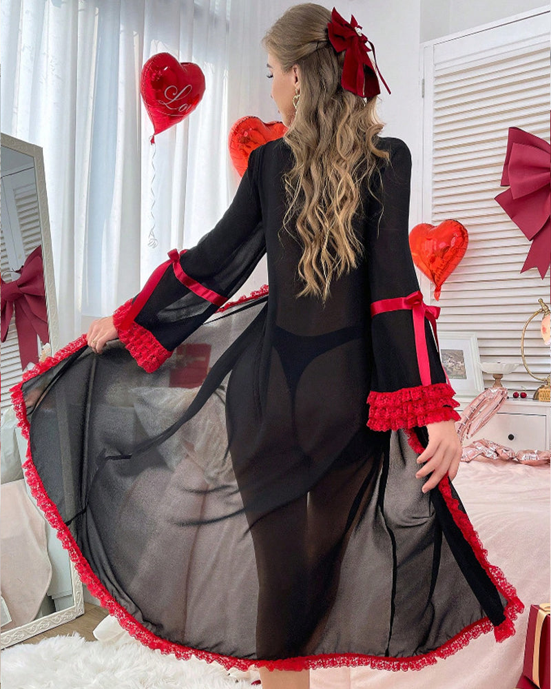 A wide scarlet satin ribbon ties at the waist in a luxurious bow, allowing you to customize coverage—from modestly draped to provocatively open.