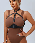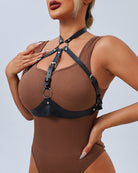 Instead of a traditional cup design, this sexy corset uses a cage or mesh structure to support and shape the breasts.