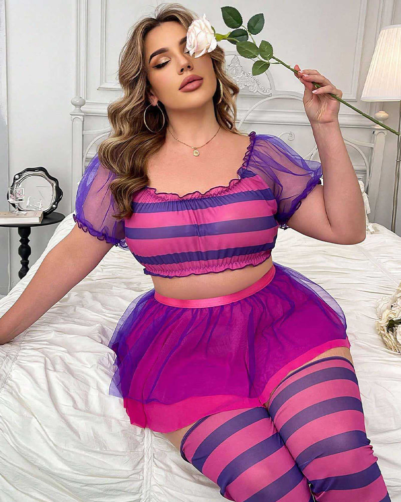 Playful, flirty fantasy in every detail. This eye-catching three-piece set features a sheer puff-sleeve crop top with bold horizontal stripes, a flouncy layered tulle mini skirt with satin waistband, and matching thigh-high stockings — designed to tease, sparkle, and command attention.